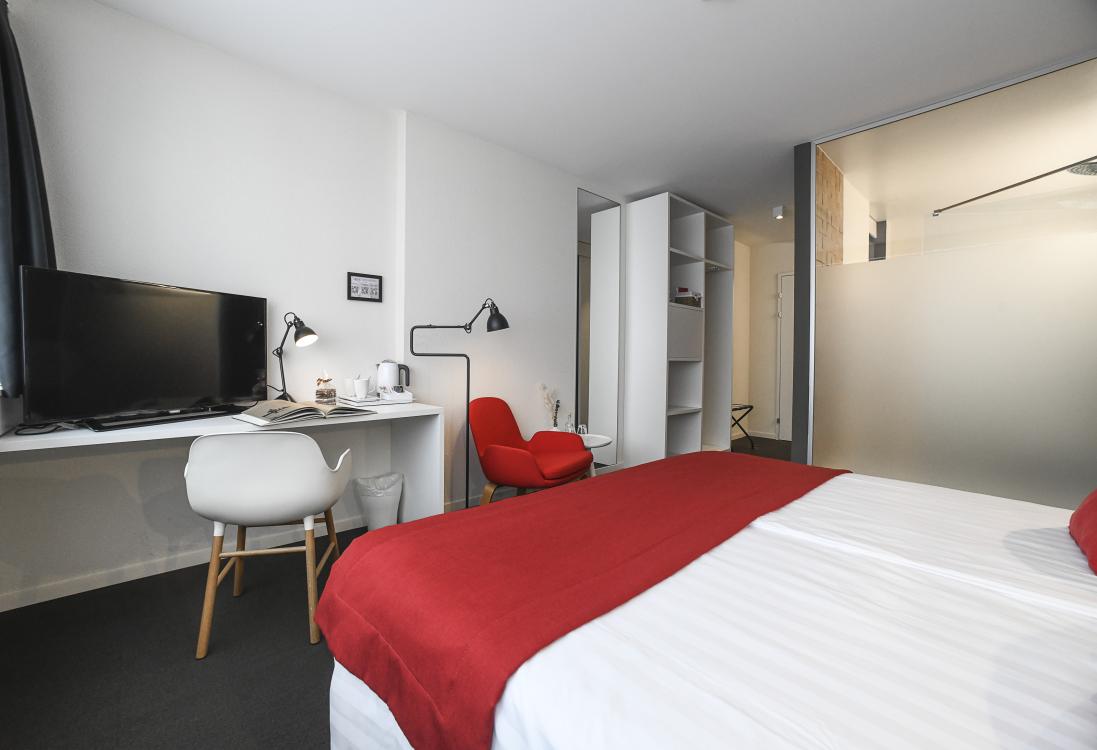 La camera è dotata di due letti singoli, un'area salotto con tavolo e poltrona, una scrivania con spazio di lavoro, TV LCD a schermo piatto con canali via cavo, doccia italiana, vassoio di cortesia con bollitore, bottiglia d'acqua e connessione wifi gratuita.